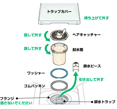 - 排水口のつまりが考えられます。排水トラップ(排水口)の髪の毛等を取り除いて、掃除をこまめに行ってください。ヘアキャッチャー(目皿)のみの清掃では不十分です。清掃の目安としましては通常は1ヶ月に1回程度、長髪の方なら2週間に1回程度です。